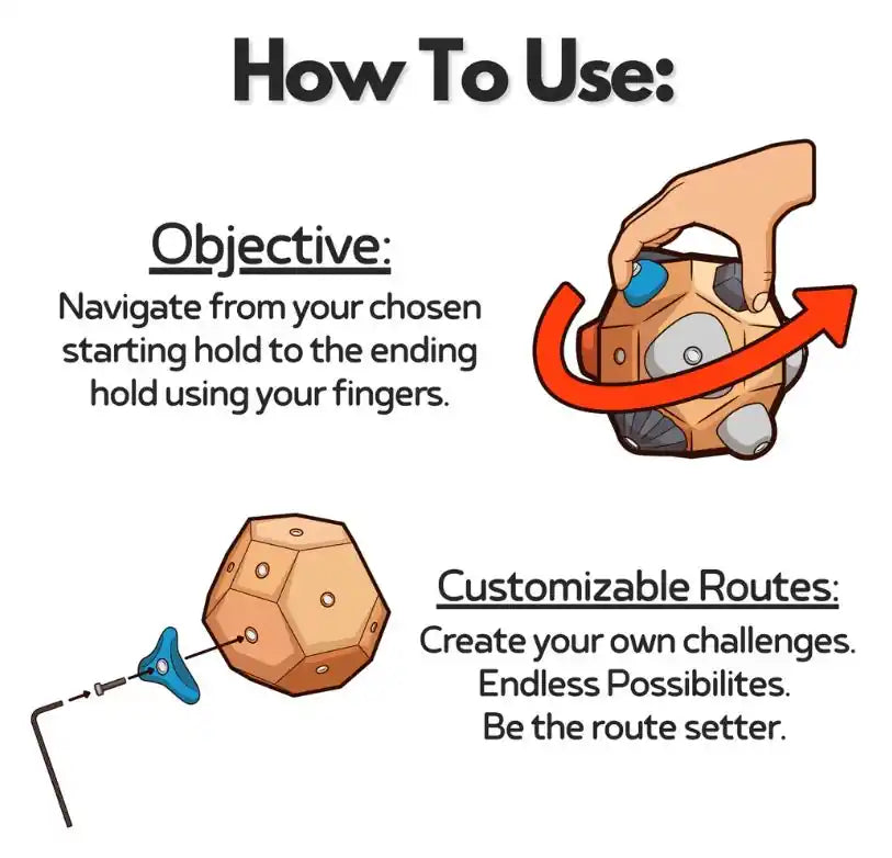 A tactile finger climbing game built for fun challenges, finger strength, and friendly competition. The wooden Boulder Block lets you set and solve mini problems with real bolt-on holds, while the Challenge Deck adds 32 clear route cards across four levels so you can train grip strength, race friends, and log sends anywhere. The kit includes the 10 cm wooden block, 12 holds with screws and Allen key, a mini boulder keychain, and a canvas pouch.