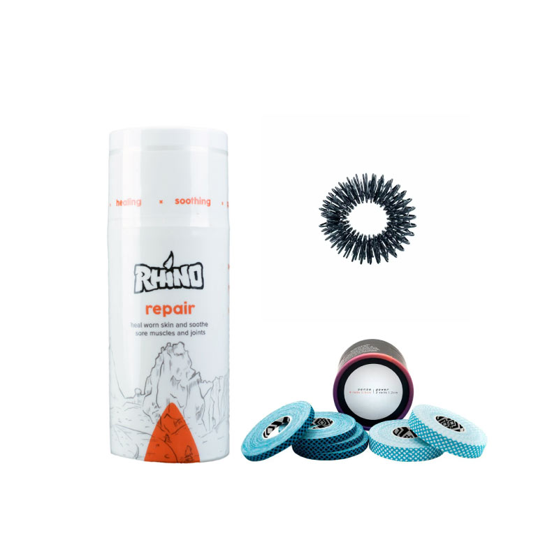 Keep your fingers in top condition with this essential skin-care and recovery bundle. Crux Tape protects problem areas, Rhino Skin Repair Lotion helps soothe and heal after tough sessions, and the Crux Finger Massage Ring promotes circulation and relief. A must-have trio for climbers who train hard.