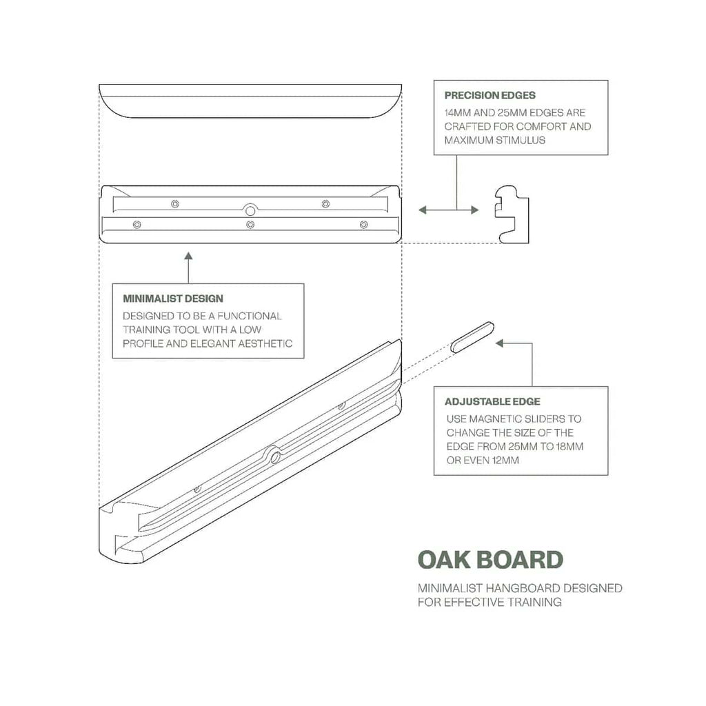 The Nature Climbing OAK Board is a minimalist training board made for climbers who want simple and effective finger strength work at home. It includes two precision cut edges at 14 mm and 25 mm with a 15 degree angle, giving you options for both crimp and open hand grip training. You can also pair it with magnetic sliders that adjust the edge to 6 mm, 10 mm, 16 mm, or 21 mm, allowing your training to progress as your strength improves.