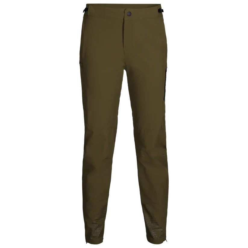 These pants feature quick-drying, water/wind-resistant bluesign® approved materials with movement-mirroring stretch that compliments every pedal stroke. DuraPrint™ technology reinforces the inner ankle for superior abrasion resistance against the toughest terrain. The 15" side zips at the hem make it easy to put knee pads on at the top of the climb, while the contoured waistband with a higher back provides essential coverage when maneuvering the bike through complex terrain. A slide lock snap closure, bonded back waistband, and Low-Pro™ side waist adjustment tabs create a custom fit. UPF50+ shields from harmful UV rays, while secure zip pockets keep essentials safe. The quick-drying, water-resistant, and wind-resistant fabric treated with DWR keeps you dry and comfortable in wet conditions.