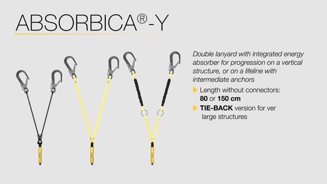 ABSORBICA®-Y is a double lanyard with compact energy absorber, designed for progression on a vertical structure or a horizontal lifeline, and for passing intermediate anchors. It functions with users weighing between 50 and 140 kg. It has several installation options on the harness and can be used with different types of connectors. It is available in two lengths: 80 or 150 cm versions (without connectors). The 150 cm version has elasticized arms to avoid hindering progression. Depending on the connectors used, ABSORBICA®-Y is certified to American, European, and Russian standards.