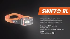 Casting 1100 lumens at a weight of only 100 g, SWIFT RL is the ultimate multi-sport headlamp for all your outdoor activities. Using REACTIVE LIGHTING® technology, a sensor analyzes the ambient light and automatically adjusts brightness to your needs. The headband is reflective to remain visible at night. Its split construction gives you excellent stability during dynamic and intense activities such as mountaineering, trail running, and skiing. SWIFT RL is intuitive to use, with a single button that easily controls all functions: ON/OFF, lighting modes, brightness, and locking. If necessary, you can also use the continuous or strobe red lighting. It is rechargeable, with a five-level gauge that allows you to monitor the battery charge level.